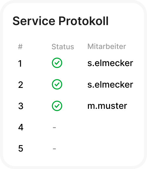 Die Struktur wird einmal festgelegt und gilt für alle. Fotos, Zustände und definierte Felder sorgen für einheitliche, lückenlose Serviceprotokolle.