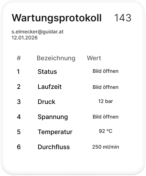 Alle Wartungsschritte, Eingaben und Fotos werden automatisch erfasst und zentral gespeichert.